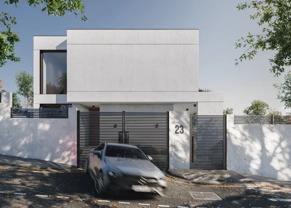 სახლის ყველაზე მაღალი წერტილიდან ეზოში რელიეფურად ჩამოდის კიბე. სადაც განთავსებულია ხის დეკით მოპირკეთებული ტერასა და აუზი. სახლის ექსტერიერზე მუშაობისას უპირატესობა მიენიჭა ვიზუალურ ესთეტიკასა და მინიმალისტურ დიზაინს.